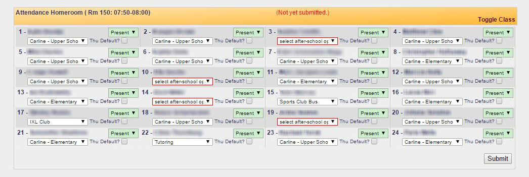 From here, you can generate signs to the families to display in carline. There is also an "Afterschool" module which highlights the family pickup lists and the students' after-school activities.