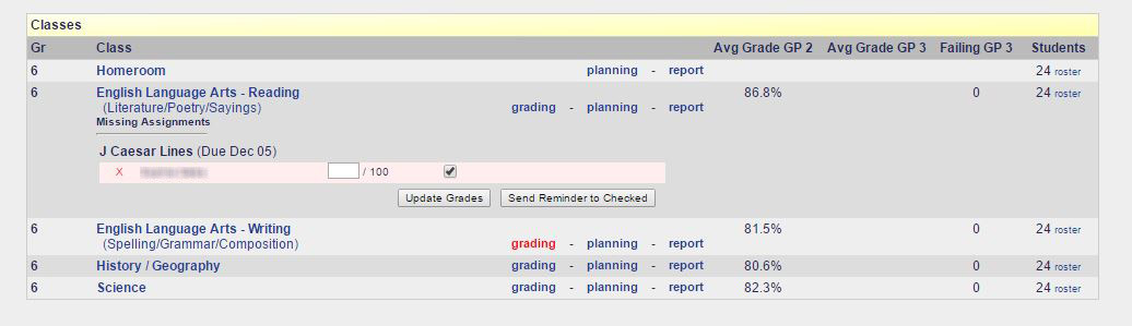 Missing student grades are displayed right in the dashboard to make it easy for teachers to follow up. A click of a button sends a notification email about missing assignments directly to the parents.