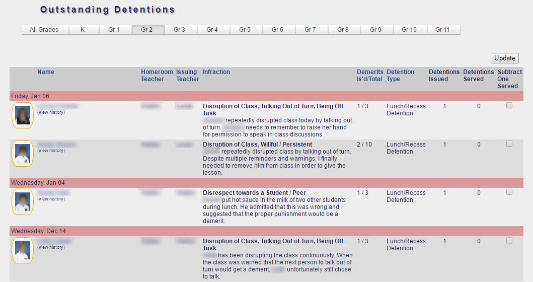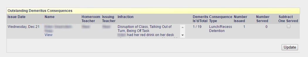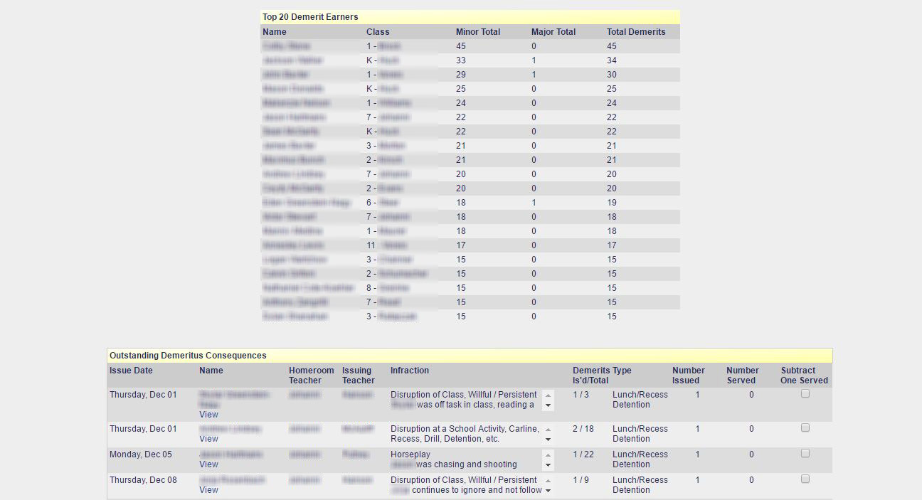 8. Admin Dashboard - Top 20 Demerit Earners: If Demeritus is used, the top 20 demerit earning studenst are displayed on the administration dashboard. Within days of the start of the school, administrators can identify those students who will need intervention strategies in order to have a successful year. The progress of the students' behavior can then be monitored easily and closely on a daily basis.