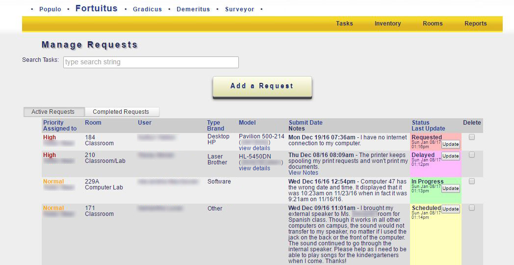 25. IT Requests: Faculty and staff can make IT requests through Fortuitus. Notifications are made instantly by email and text to the IT technicians. This page tracks their IT requests and allows them to update the status and make notes about the repairs. A repair history is linked to each item of equipment for future reference.