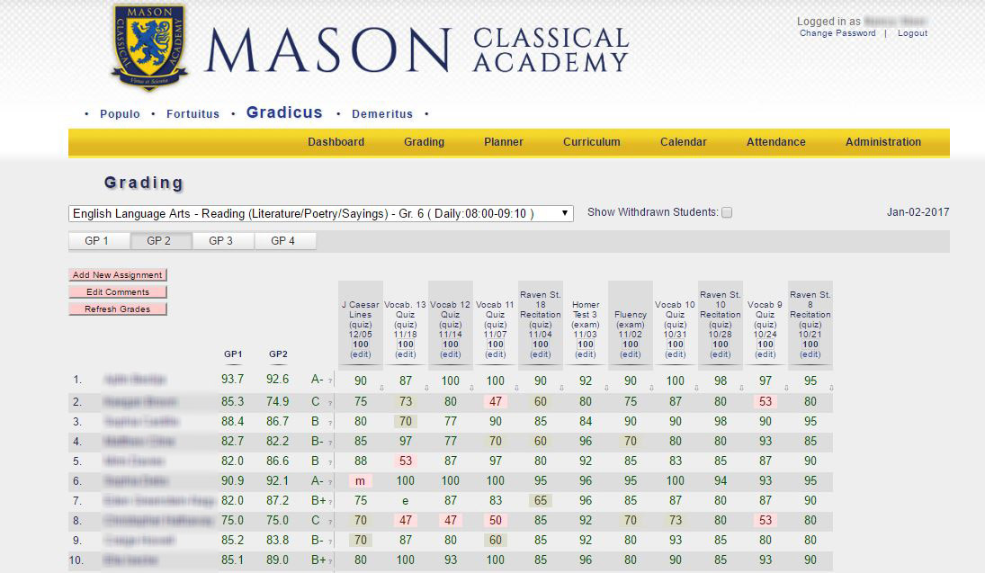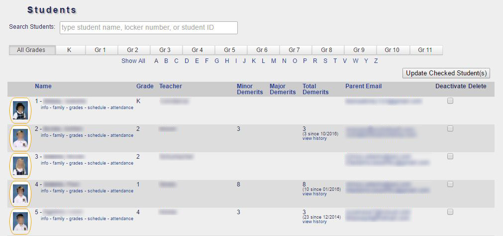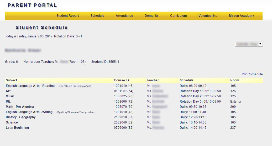 18. Parent Portal: The Gradicus Parent Portal allows parents to access much of the available information about their own children, including grades, assignment and test scores, schedules, attendance history, discipline history (demerits), subject curricula, as well as enter volunteer hours and view their volunteering history.
