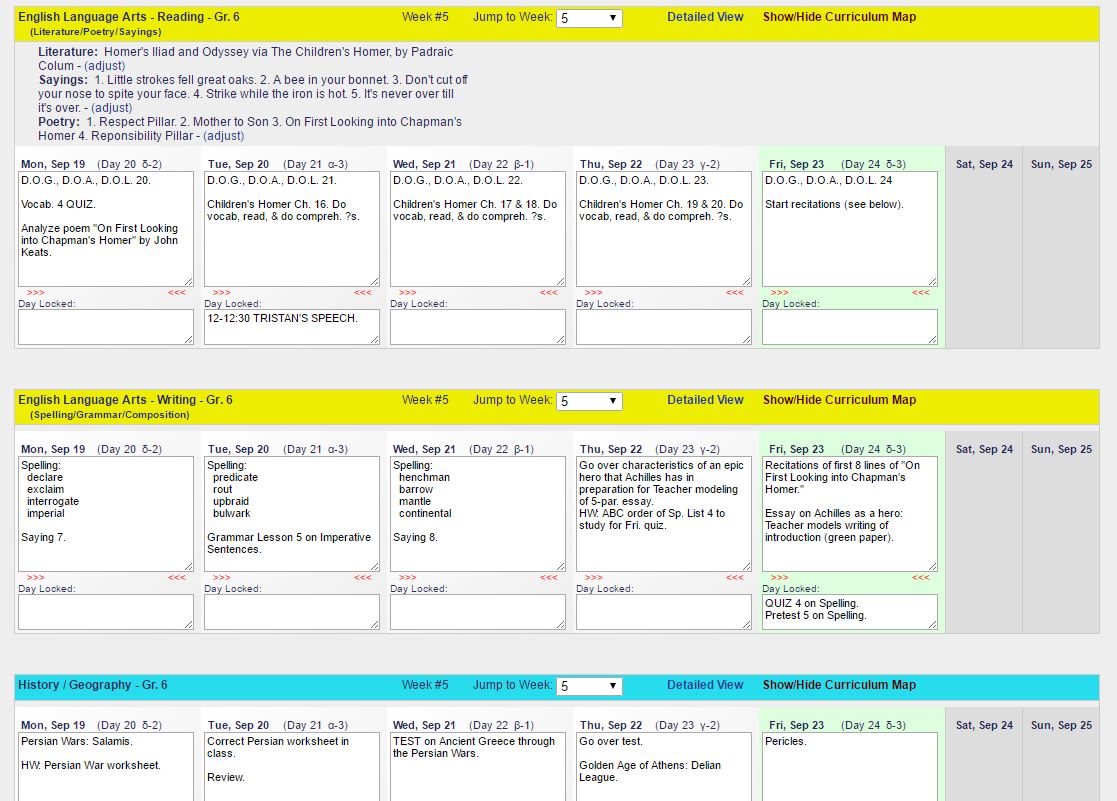 The curriculum map can be toggled open to show where in the plans the class should be that week. This view can be printed out as a PDF for convenience.